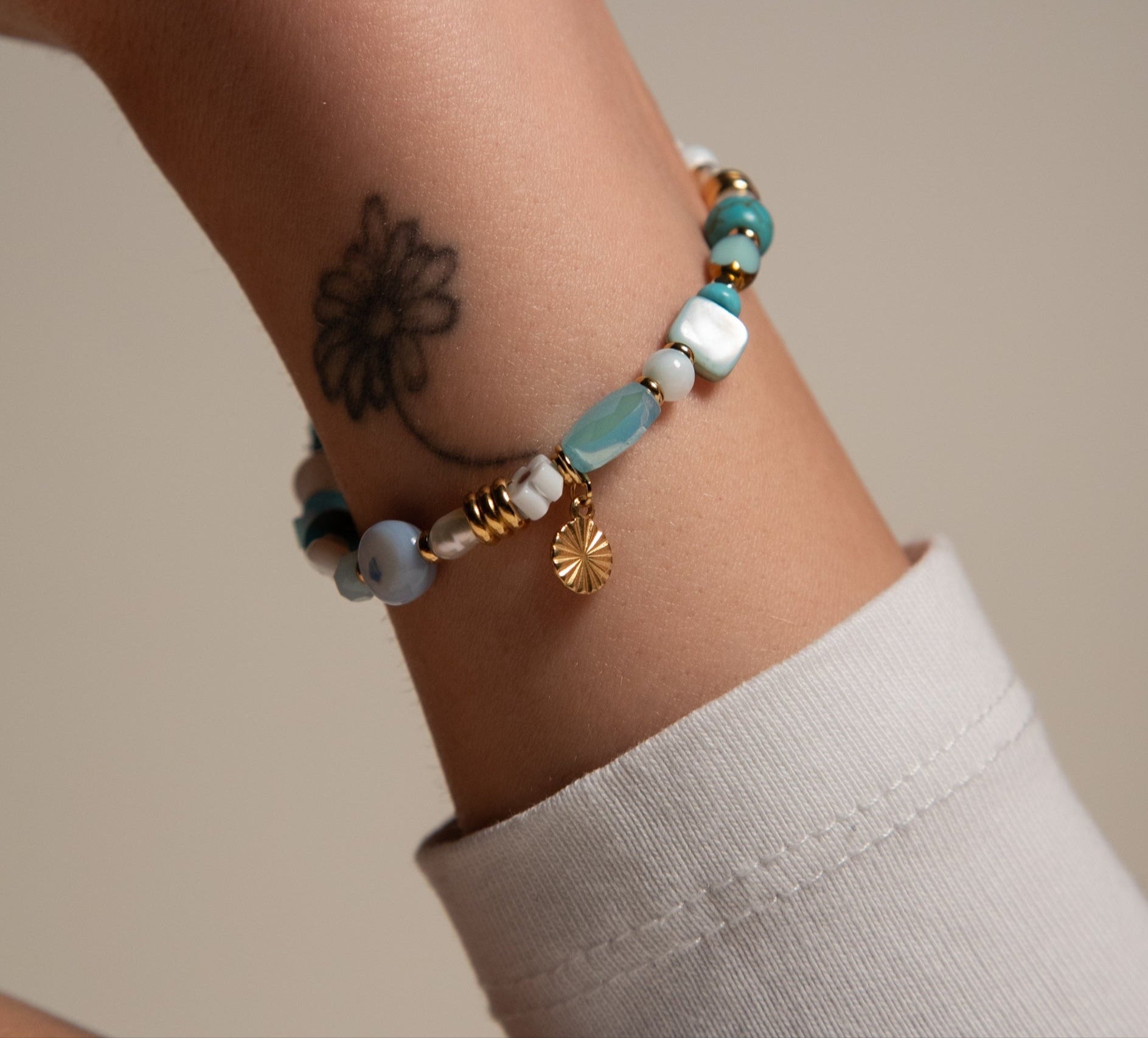 Jedes Armband wird von mir mit viel Liebe zum Detail handgefertigt – unter Verwendung hochwertiger Perlen aus Edelsteinen, Muscheln und Glas. Dank des vergoldeten Edelstahls als Grundmaterial sind die Armbänder wasserfest und laufen nicht an, sodass du lange Freude an ihnen hast.