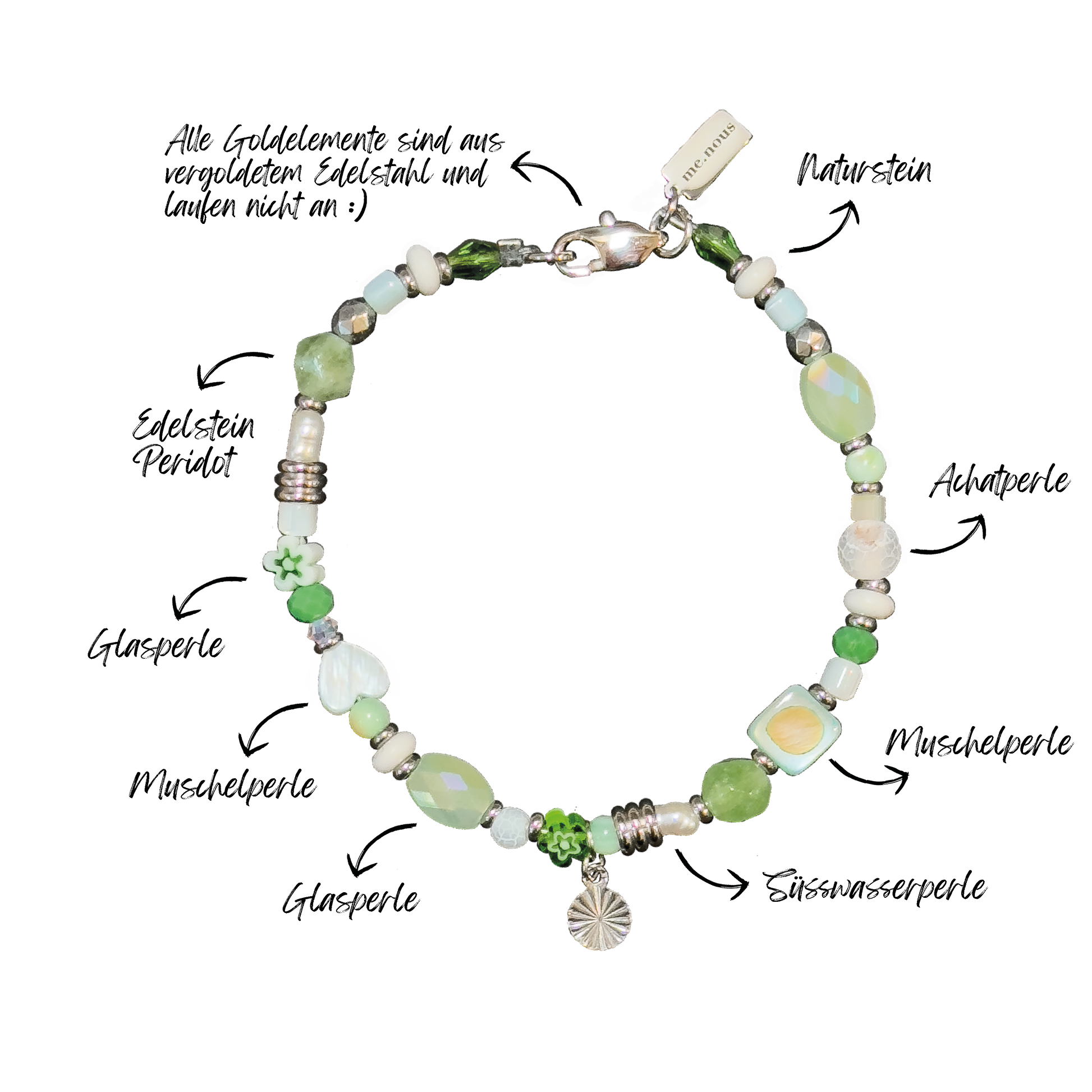 Jedes Armband wird von mir mit viel Liebe zum Detail handgefertigt – unter Verwendung hochwertiger Perlen aus Edelsteinen, Muscheln und Glas. Dank des Edelstahls als Grundmaterial sind die Armbänder wasserfest und laufen nicht an, sodass du lange Freude an ihnen hast.